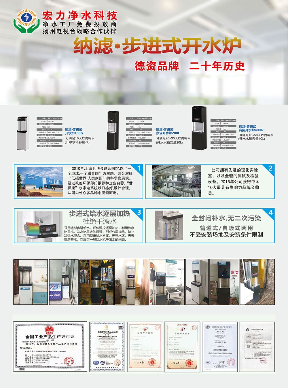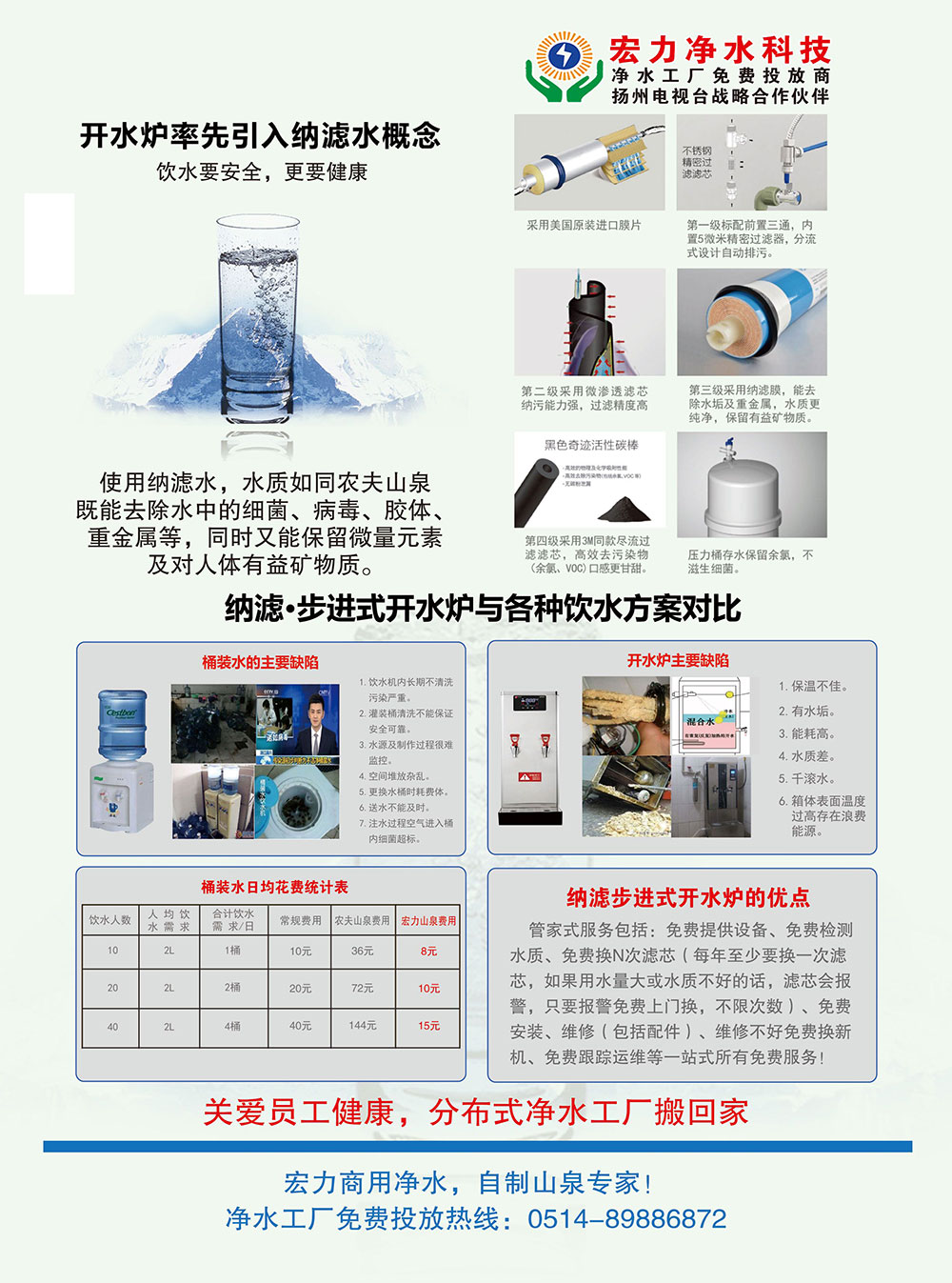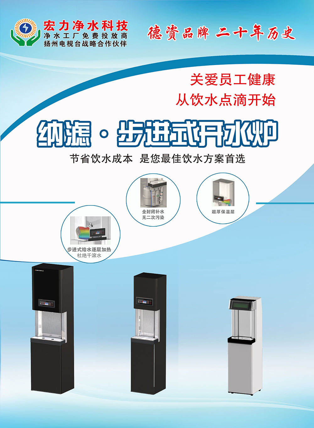 扬州宏力净水科技有限公司是江苏宏力新能源发展有限公司开拓的第二板块业务,宏力公司是专业从事太阳能、空气、水清洁能源设计、销售、安装、和服务为一体的技术服务型公司,致力于为家庭、工商业提供可靠、节能、环保且环境友好型清洁能源。宏力净水科技公司专门为企事业单位免费提供商用净水开水炉,我们采用设备租赁模式,免费提供设备、免费安装、维修,免费检测水质、免费更换滤芯、免费跟踪运维等一站式全免服务,保证用户饮水的安全及健康。过滤净化后的水质同矿泉水水质一样甘甜可口。宏力商用净水是专业的商用净水炉推广商及服务商!